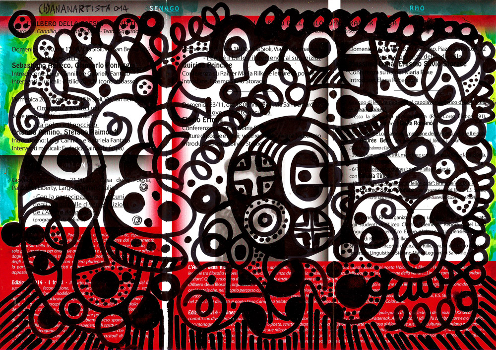 “Sangue e detriti per Rainer Maria Rilke” – tecnica mista su volantino de “l’albero della poesia e della filosofia” – (b)ananartista 014 – http://www.bananartista.com