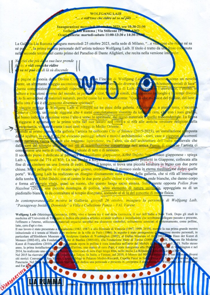 Tecnica mista su comunicato stampa della mostra di Wolfgang Laib “…e vidi cose che ridire né sa né puo …” presso la galleria Lia Rumma a Milano (29,7 x 21 cm)